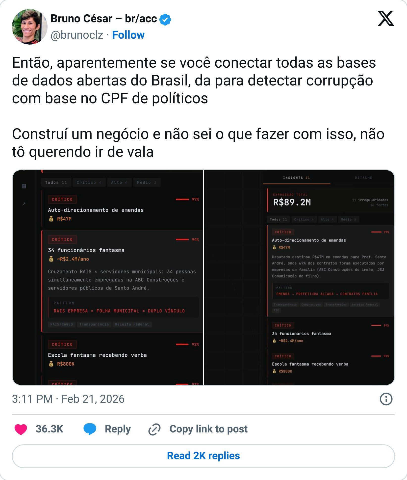 O projeto é atribuído a Bruno César, que apresentou uma demonstração no X com interface baseada em grafos, conectando pessoas físicas, pessoas jurídicas e fluxos de recursos. Entre os casos destacados estão emendas destinadas a municípios em que contratos depois foram executados por empresas associadas a familiares de parlamentares, além de inconsistências que incluem possíveis “funcionários fantasma” e repasses a instituições de ensino com indícios de irregularidade cadastral.